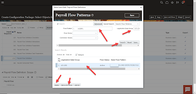 - Now search for the Payroll Flow Pattern which you want to migrate and once the search completed, select the flow and click on apply. Similarly add all the other flow which you want to migrate. Once all the flows are added , click Save and Close.