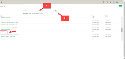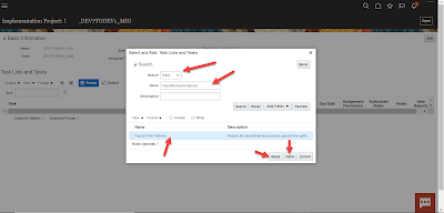 - Select ‘ Tasks ‘ in the search drop down menu list and in Name box enter ‘Payroll Flow Patterns’ and then click search button. Select the search result (Payroll Flow Patterns) and then click Apply and then click Done.