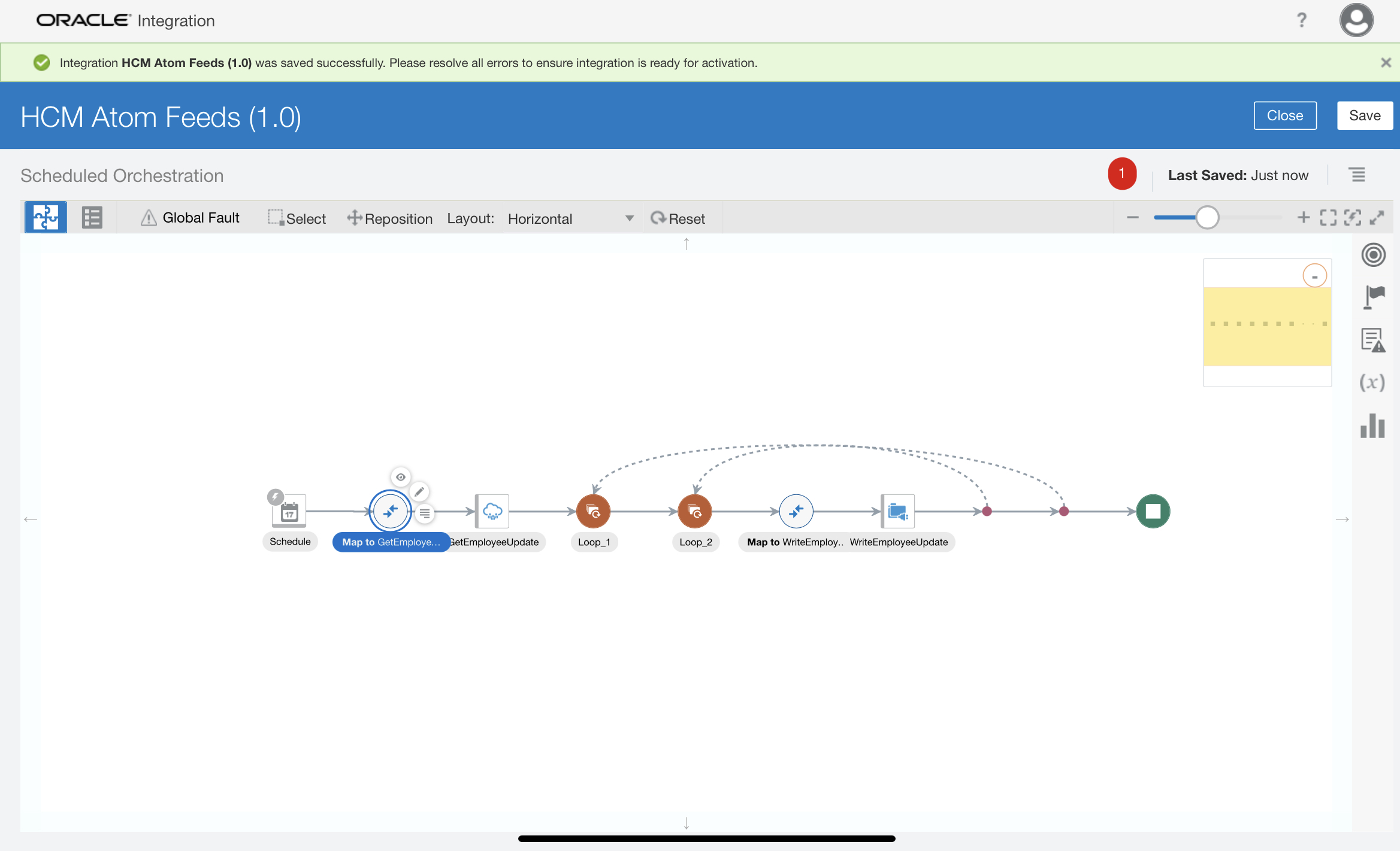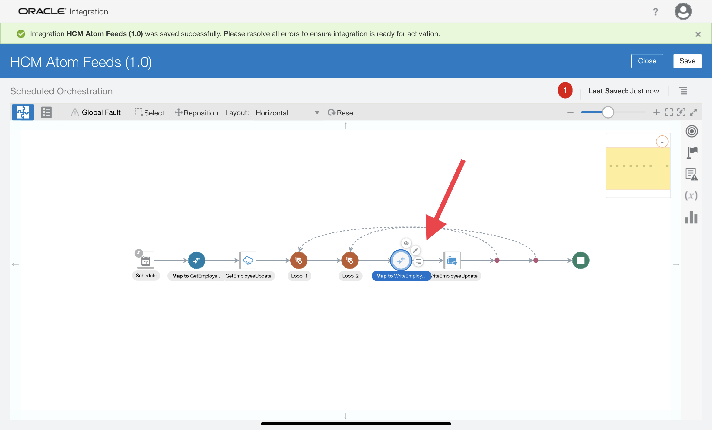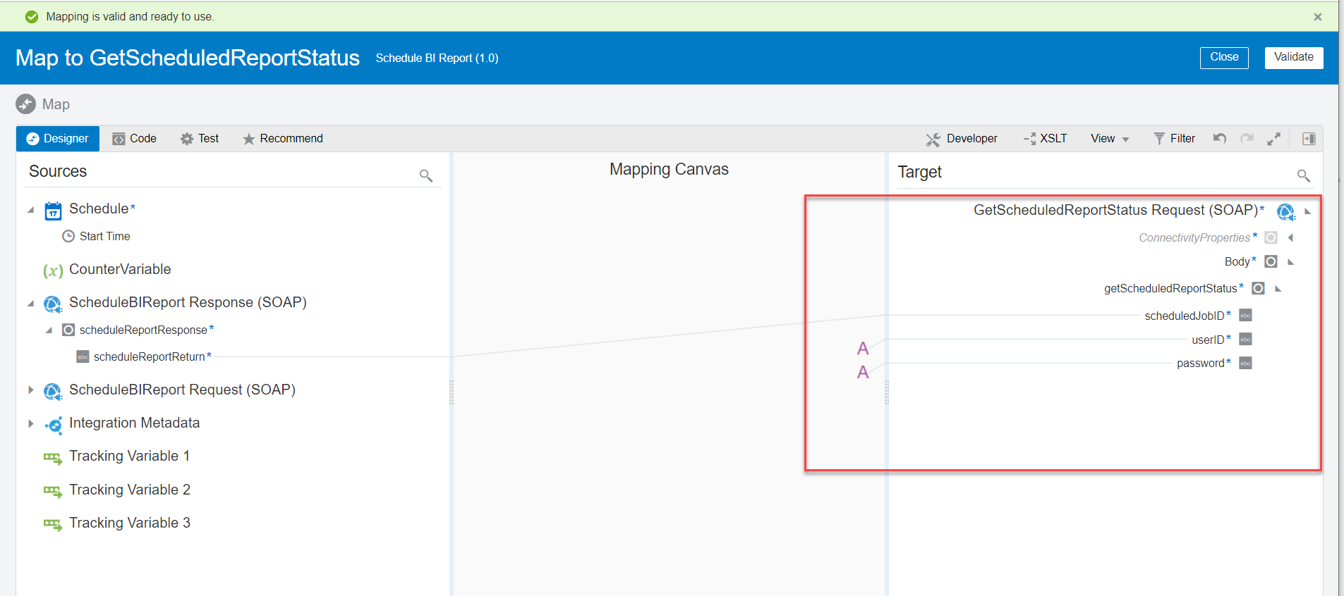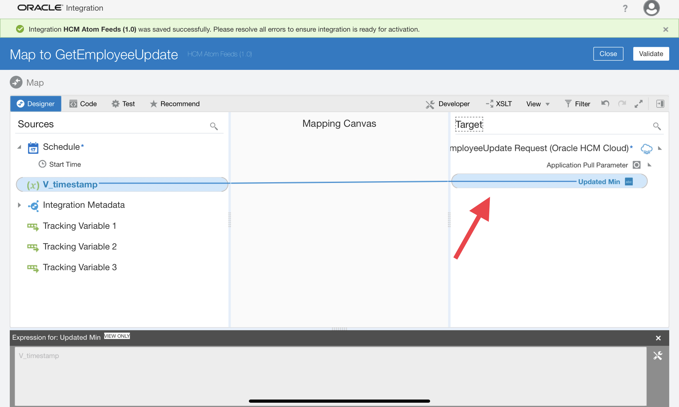 - In the request mapper between the schedule and the Oracle HCM Cloud Adapter, map the above scheduled parameter (timestamp value) to Updated-min. Click Validate and Close the mapper.
