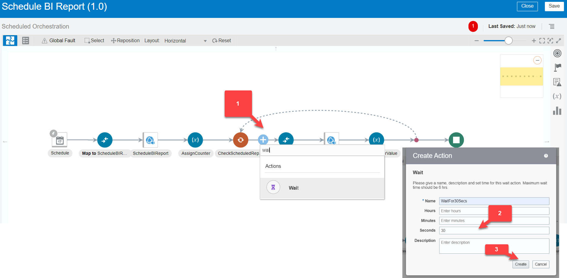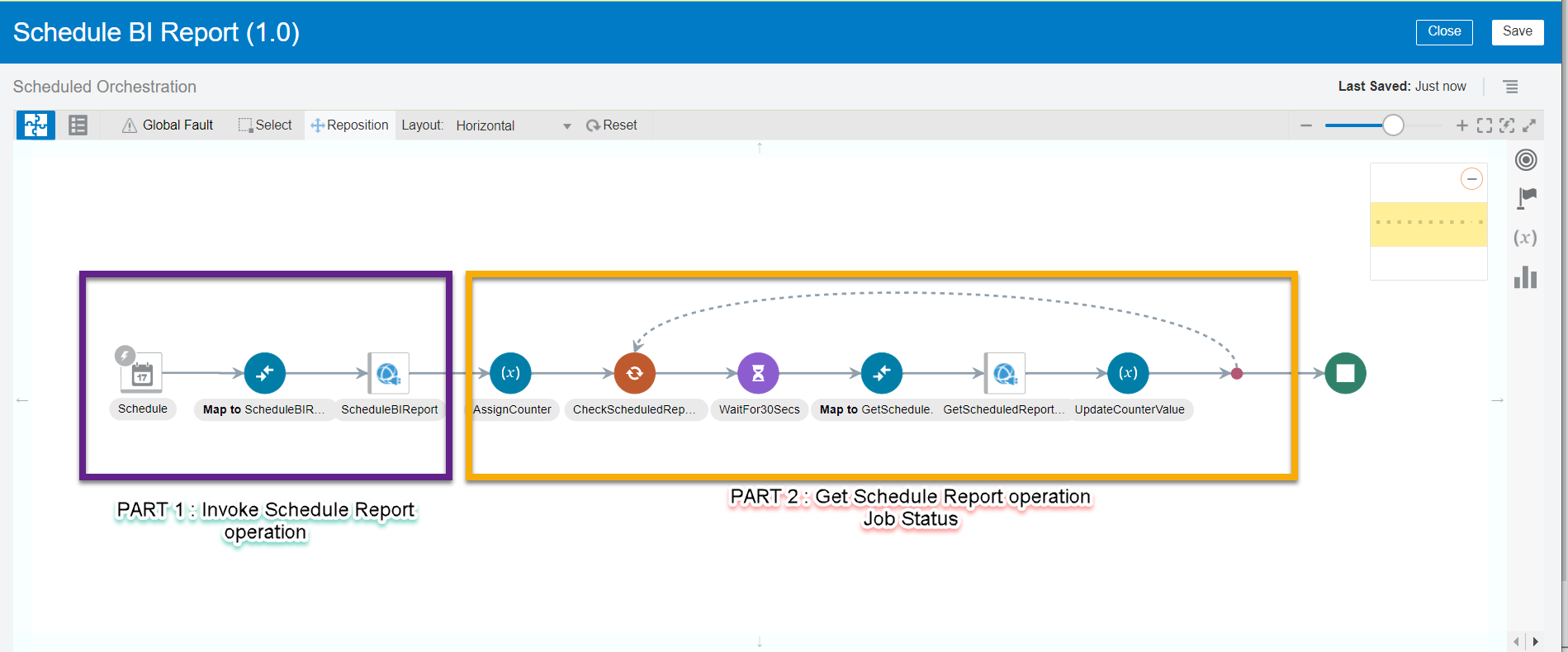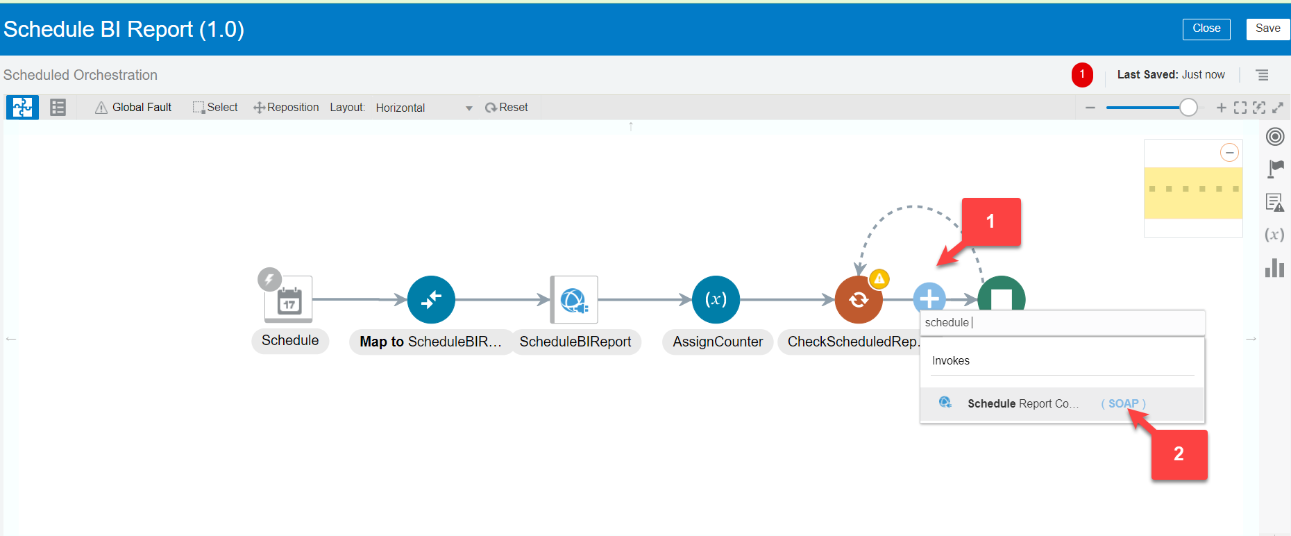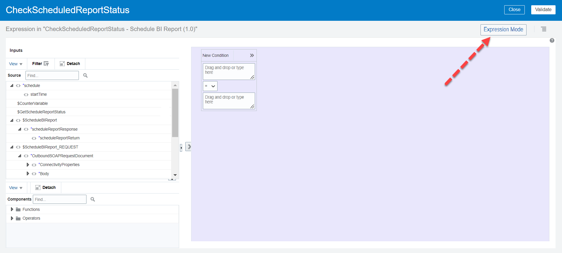- In the request mapper between the schedule and the Oracle HCM Cloud Adapter, map the above scheduled parameter (timestamp value) to Updated-min. Click Validate and Close the mapper.