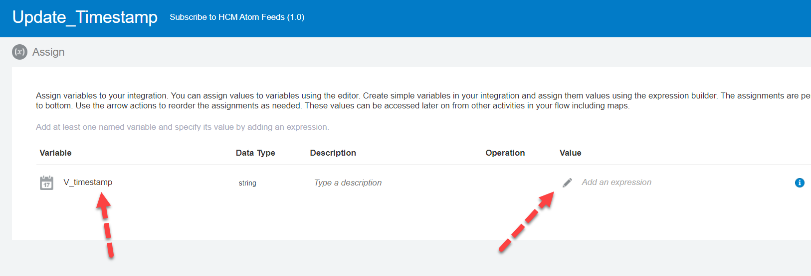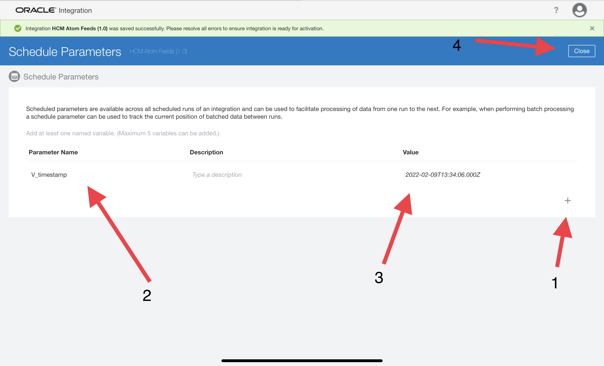 Step 6 : Now we need to create one Schedule Parameter, which will actually be the Input Parameter of the Invoke HCM ATOM FEED. This Parameter will store the Timestamp value. This value will get updated after every run of the Integration. This enables new updates to be processed every time and prevents the same update from being processed multiple times.